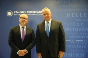 Σε θερμό κλίμα πραγματοποιήθηκε σήμερα, στο Υπουργείο Μετανάστευσης και Ασύλου, η συνάντηση του Υπουργού κ. Θάνου Πλεύρη με τον Πρέσβη του Ηνωμένου Βασιλείου στην Αθήνα, κ. Matthew Lodge. Κατά τη διάρκεια της συζήτησης, ο Βρετανός Πρέσβης εξέφρασε έντονο ενδιαφέρον για το νέο νομοσχέδιο του Υπουργείου Μετανάστευσης και Ασύλου, το οποίο προβλέπει αυστηροποίηση του πλαισίου για