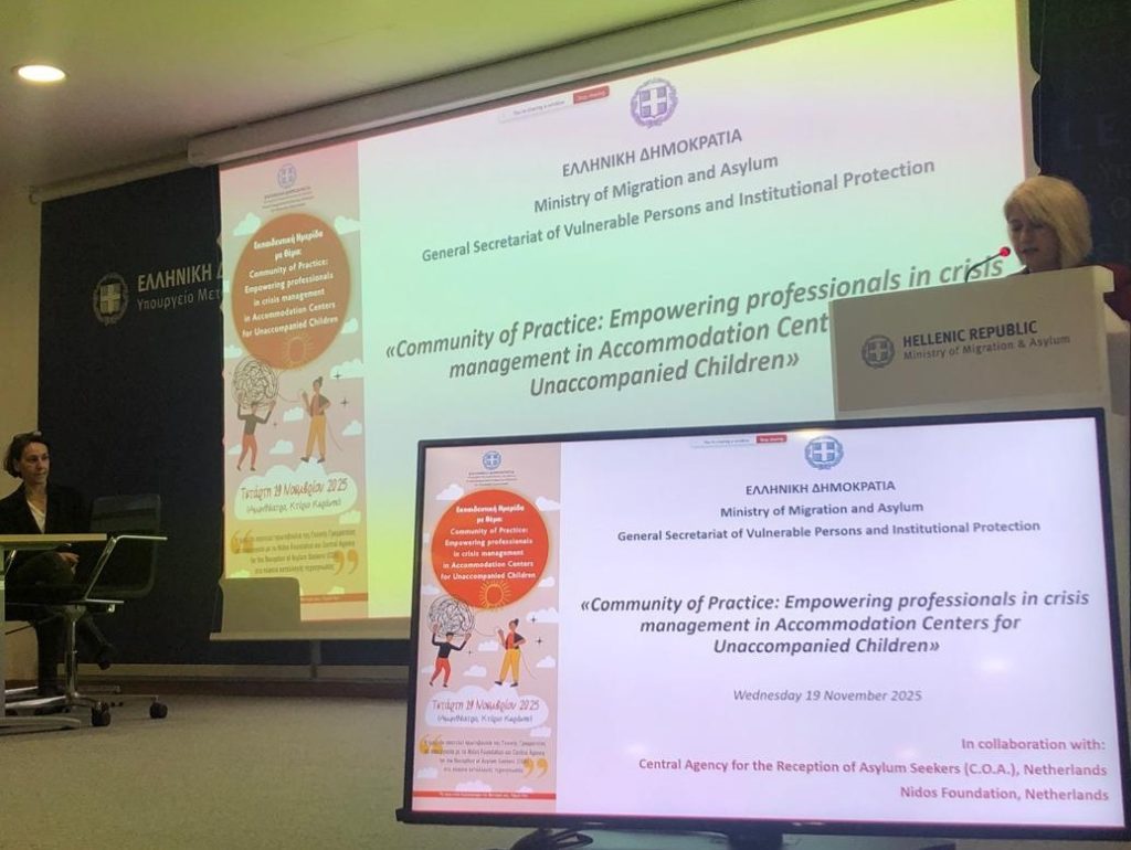 Η Μονάδα Εποπτείας και Αξιολόγησης Κέντρων Φιλοξενίας της Γενικής Γραμματείας Ευάλωτων Πολιτών και Θεσμικής Προστασίας πραγματοποίησε εκπαιδευτική ημερίδα με θέμα “Community of Practice: Empowering professionals in crisis management in UAC Accommodation Facilities” / «Κοινότητες Πρακτικής: Ενδυνάμωση Επαγγελματιών στη Διαχείριση και Πρόληψη Κρίσεων σε Δομές Φιλοξενίας Ασυνόδευτων Ανηλίκων». Βασικοί ομιλητές στην ημερίδα ήταν εκπρόσωποι από το Υπουργείο Δικαιοσύνης και Ασφάλειας της Ολλανδίας και από τον Εθνικό Φορέα Επιτροπείας Ασυνόδευτων Ανηλίκων “NIDOS” οι οποίοι εργάζονται σε δομές και προγράμματα ασυνόδευτων ανηλίκων.