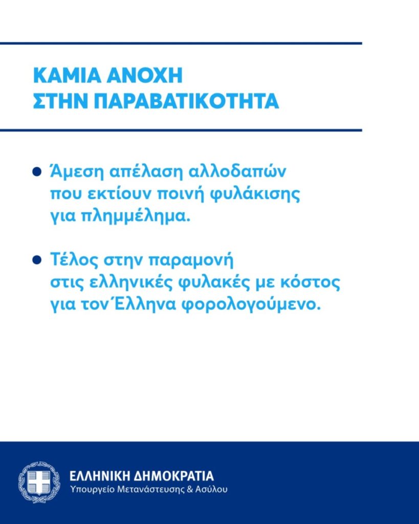 Με το σχέδιο νόμου «Προώθηση Πολιτικών Νόμιμης Μετανάστευσης», η Ελλάδα χαράσσει μια συνεκτική και ολοκληρωμένη μεταναστευτική πολιτική, αυστηρή απέναντι στην παρανομία, ανοικτή αποκλειστικά στη νόμιμη κινητικότητα και πλήρως ευθυγραμμισμένη με τις πραγματικές ανάγκες της οικονομίας και της κοινωνίας.